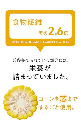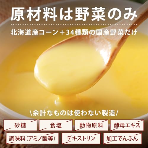 原材料を見て驚きました。「野菜」だけなんです。砂糖も食塩も、酵母エキスすら入っていません。北海道産コーンと34種類の国産野菜パウダーだけで作られています。お湯で溶かすだけなので、忙しい朝や、味付けをしていないので赤ちゃんの離乳食にも最適です。